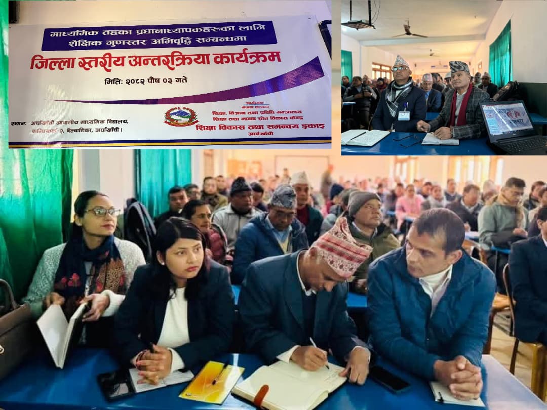 माध्यमिक तहका प्रधानाध्यापकहरूका लागि शैक्षिक गुणस्तर अभिवृद्धि सम्बन्धी जिल्ला स्तरीय अन्तरक्रिया कार्यक्रम बिहीबार सन्धिखर्कमा सम्पन्न भएको छ । शिक्षा विकास तथा समन्वय इकाइ अर्घाखाँचीको आयोजनामा सम्पन्न कार्यक्रमको जिल्ला समन्वय समिति अर्घाखाँचीका प्रमुख जीवनारायण कोइरालाले उद्घाटन गर्नुभएको हो । कार्यक्रममा बोल्दै समन्वय प्रमुख कोइरालाले शैक्षिक गुणस्तर सुधारका लागि विद्यालय नेतृत्वको भूमिका महत्वपूर्ण हुने बताउनुभयो । उहाँले शिक्षक, प्रधानाध्यापक, अभिभावक र सरोकारवालाबीचको सहकार्यबाट मात्र शिक्षा क्षेत्रमा अपेक्षित सुधार सम्भव हुने उल्लेख गर्नुभयो । शिक्षा व्यवहारिक, जीवनोपयोगी र समयसापेक्ष हुनुपर्नेमा उहाँको जोड थियो ।